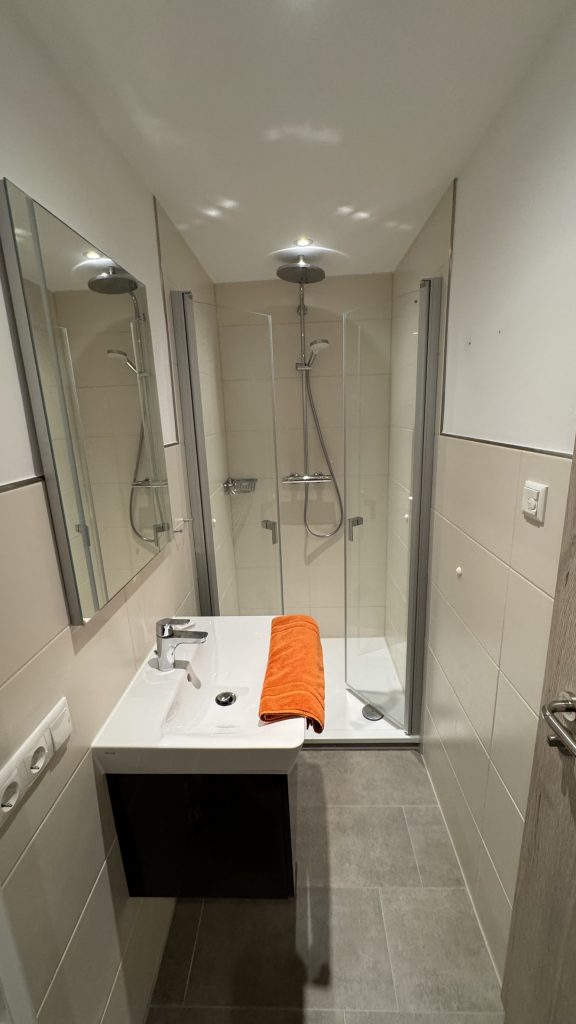 Es umfasst ein komfortables Doppelschlafzimmer, ein modernes Bad mit Dusche und WC sowie einen hellen Wohnbereich mit integrierter Küchenzeile und französischen Balkon. Im Wohnbereich befindet sich zudem ein Schlafsofa, das einer weiteren Person eine gemütliche Schlafmöglichkeit bietet.
