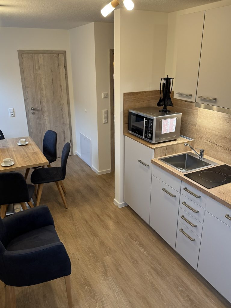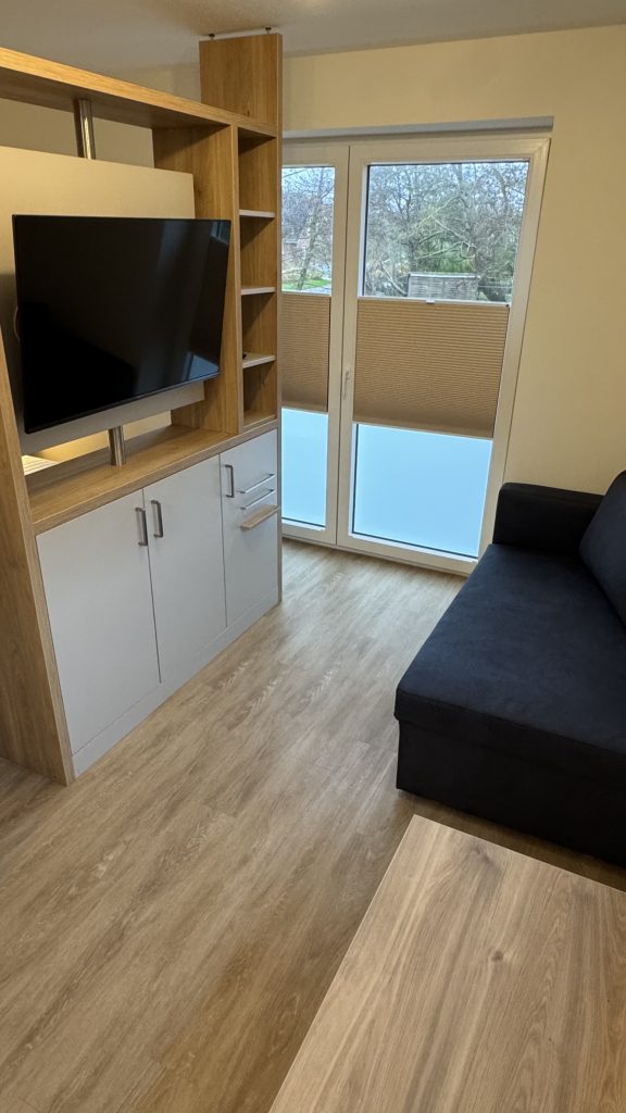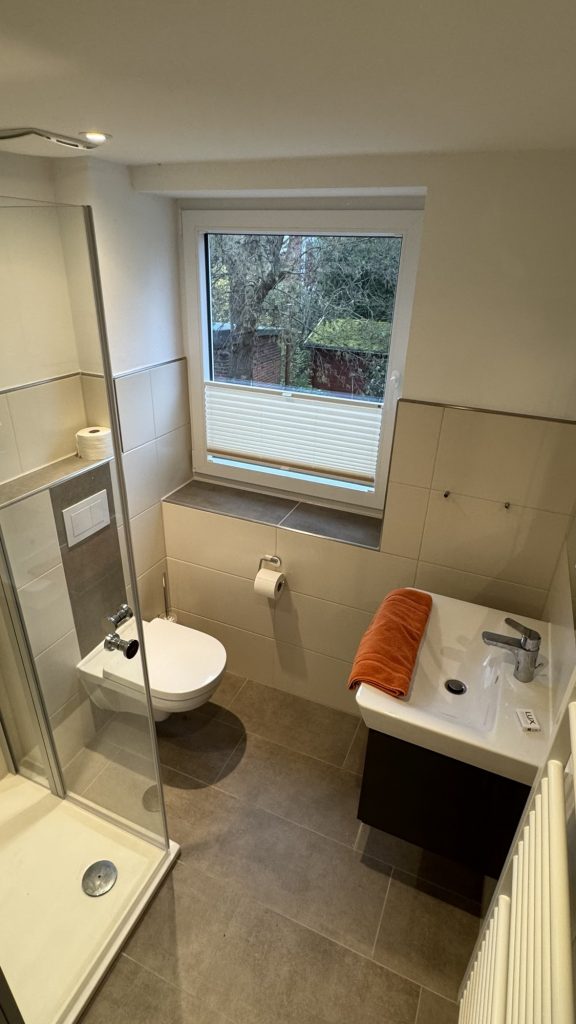 Ein modernes Bad mit Dusche und WC rundet das Raumangebot ab und macht dieses Apartment zur perfekten Wahl für Paare oder kleine Familien.